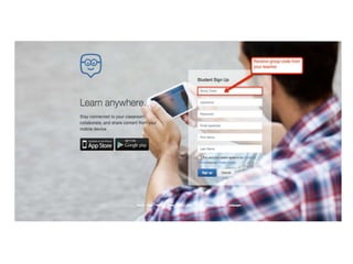 This document provides an overview of the Edmodo learning platform for students, including what Edmodo is, how students can use it, and how to get started with an account. It summarizes that Edmodo is a Facebook-like online learning platform that allows students to participate in discussions, submit assignments, take quizzes, and access resources from their teacher. It provides step-by-step instructions for students to create a free account by obtaining a group code from their teacher and joining their teacher's group on Edmodo. The document also previews the key features and interface elements students will see on their Edmodo homepage and profile.