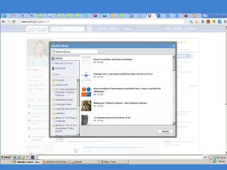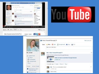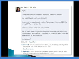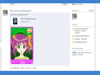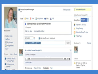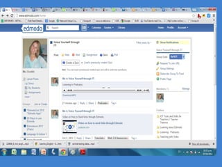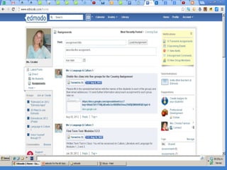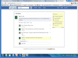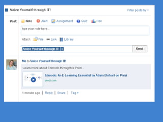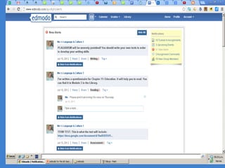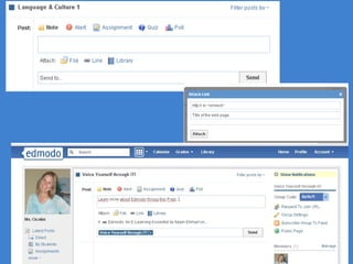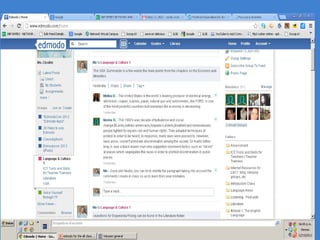 This document discusses how the educational platform Edmodo can be used as a virtual learning environment to enhance language learning. It provides examples of how Edmodo allows teachers to share class materials, students to submit assignments, and facilitates communication between teachers and students. Additional ideas are presented such as using Edmodo for book clubs, facilitating discussions, organizing collaborative projects in small groups, and keeping parents informed.