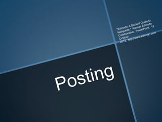 This document provides tips for proper etiquette when communicating on Edmodo. Key points include using proper spelling and avoiding all capital letters or excessive punctuation. Students should post questions to the whole group if it relates to assignments, but direct messages to the teacher for personal issues. Discussions should stay on topic without teasing, bullying or inappropriate content, and teachers should be notified if anything violates the guidelines.