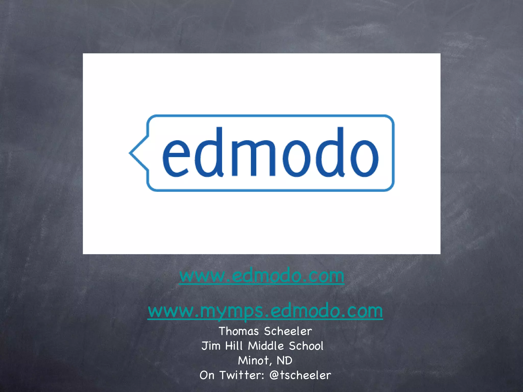 Edmodo is a secure, free social learning platform designed for teachers, students, and parents to facilitate communication, collaboration, and access to educational materials. It allows users to share various forms of digital content, manage assignments, and provides organizational tools including a gradebook and notifications. Parent accounts will soon enable parents to communicate with teachers and monitor their children's assignments and grades.