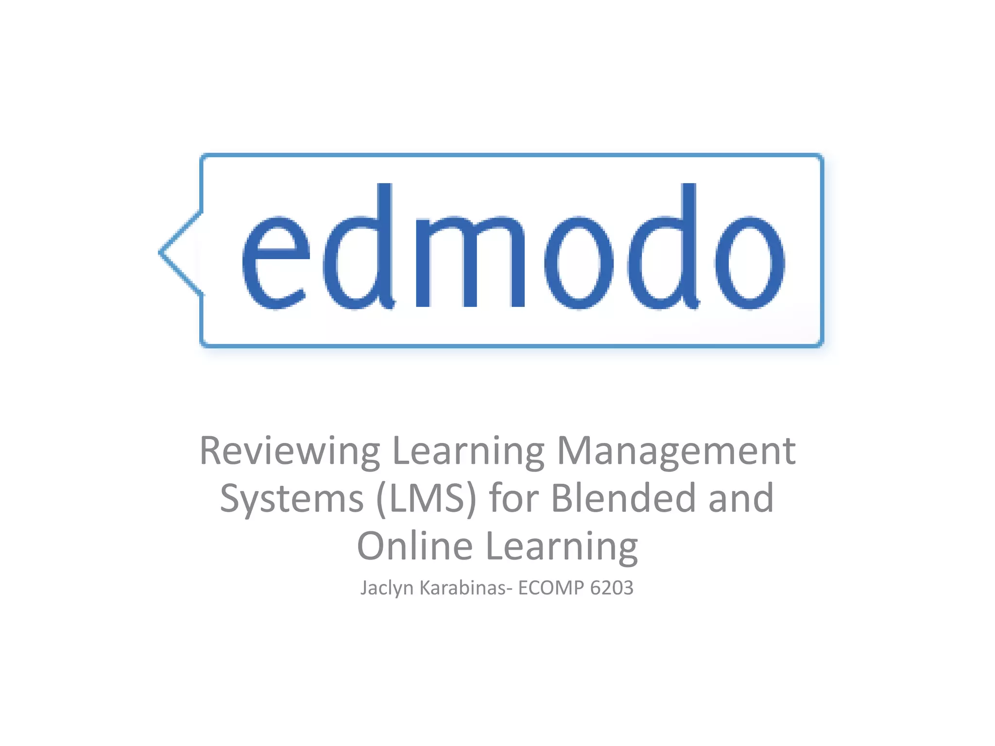 Edmodo is a free social learning platform that allows teachers and students to connect, share resources, and collaborate. Key features include secure messaging and file sharing, group creation and management, grading, and mobile access. Edmodo aims to provide an engaging environment for blended and online learning through communication tools, a collaborative discussion space, and integration with other educational applications and resources.