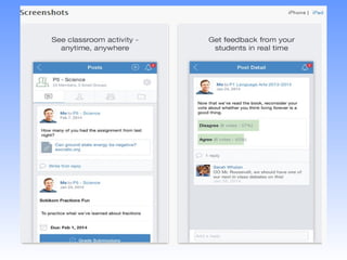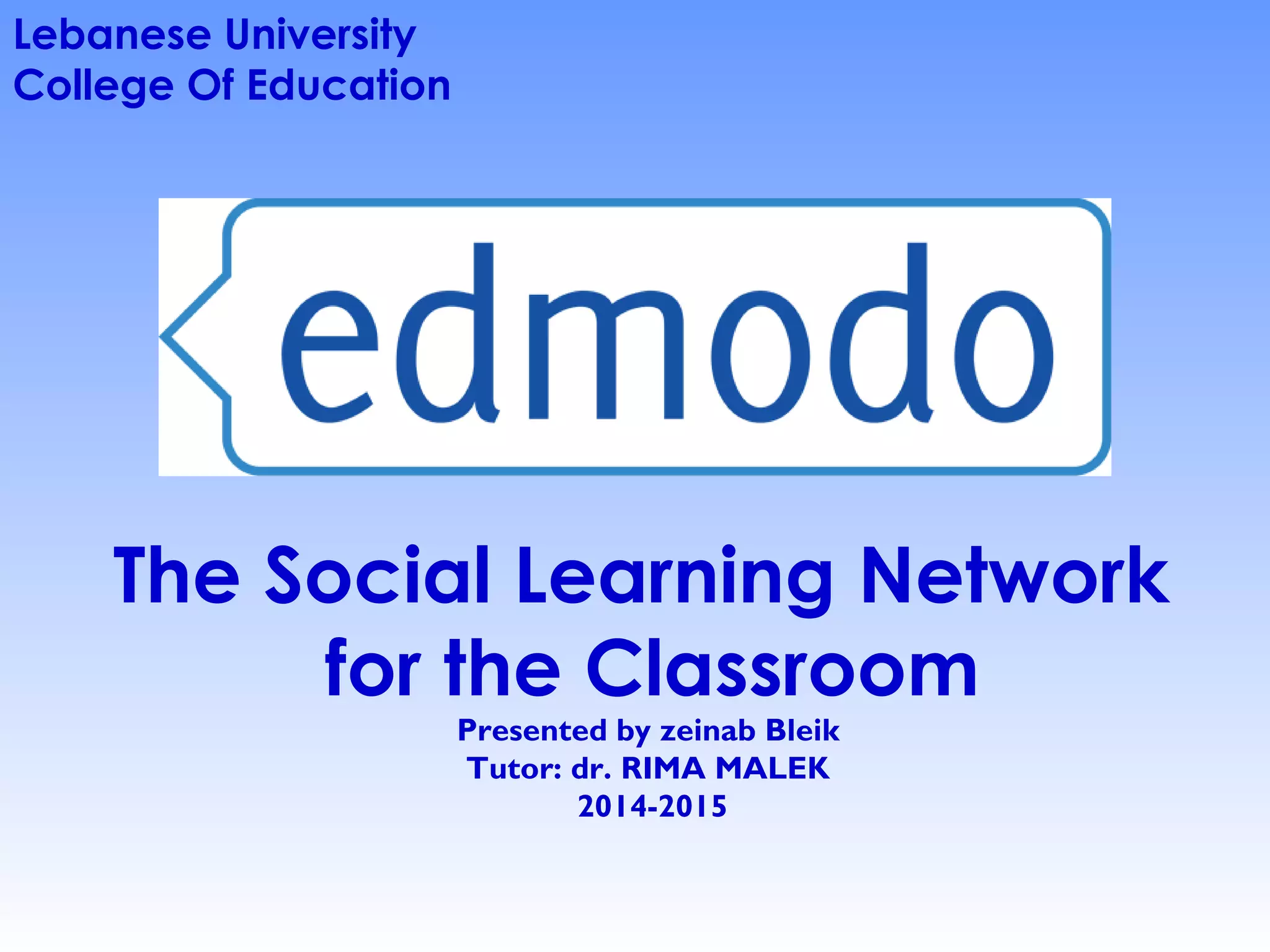 Edmodo is a social learning platform that allows teachers to communicate with students and parents about classwork. It functions similarly to Facebook but with privacy and security features tailored for education. Teachers can create classes/groups on Edmodo and share assignments, files, polls and quizzes. Students join using a class code from their teacher. Over 500,000 students worldwide use Edmodo, which is free for teachers and students. The presenter encourages teachers to explore Edmodo's features to enhance communication and learning in their classroom.
