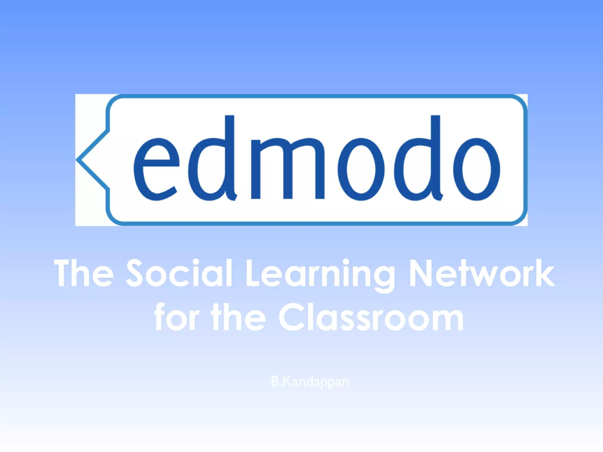 This document provides an overview of the key features of Edmodo, a social learning network for use in classrooms. It explains that students can join groups using a group code without needing an email. Key features highlighted include that it is free, has no ads, allows communication through notes, alerts, assignments, polls, and apps. Teachers can create subgroups, set up a class calendar, use a gradebook, and share files and content with students.