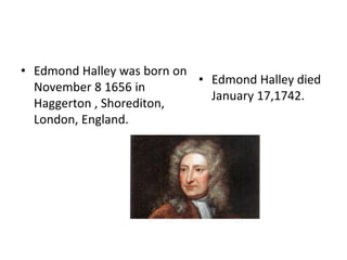 Edmond Halley was an English scientist born in 1656 who made important contributions to astronomy, physics, and mathematics. He is best known for predicting the orbit of Halley's Comet and publishing the first mathematical model of its orbit. Halley studied many fields including geophysics, mathematics, meteorology, and physics. He published an influential book reconstructing the lost book of conics by Apollonius.