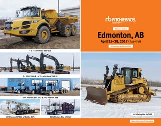 This document announces an unreserved public auction to be held April 25-28, 2017 in Edmonton, Alberta featuring construction equipment, trucks, and real estate. The auction will include items from several construction and oilfield service companies that are retiring or restructuring including dump trucks, boom trucks, vacuum trucks, crawler tractors, pipe layers, and real estate properties. An onsite preview of the equipment will be available and online bidding is offered at the listed website.