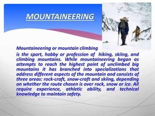 Mountaineering involves hiking, skiing, and climbing mountains. It began as attempts to reach high unclimbed mountain peaks but has expanded to include rock climbing, snow climbing, skiing, and maintaining safety. Sir Edmund Hillary was a famous New Zealand mountaineer who in 1953 became the first person confirmed to reach the summit of Mount Everest with Tenzing Norgay. He devoted much of his later life to philanthropic work to help the Sherpa people of Nepal through the Himalayan Trust that he founded. He died in 2008 at the age of 88.
