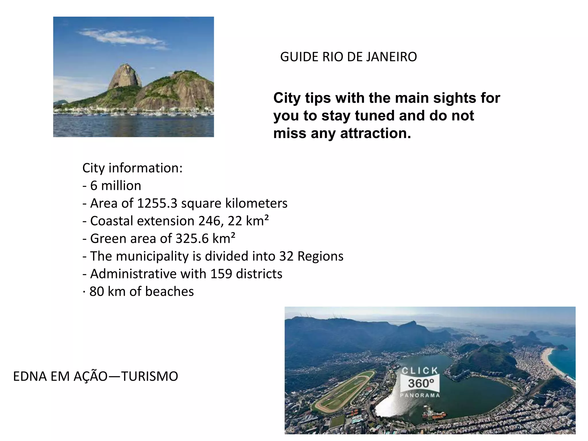This document provides information about attractions to visit in Rio de Janeiro, Brazil, including: