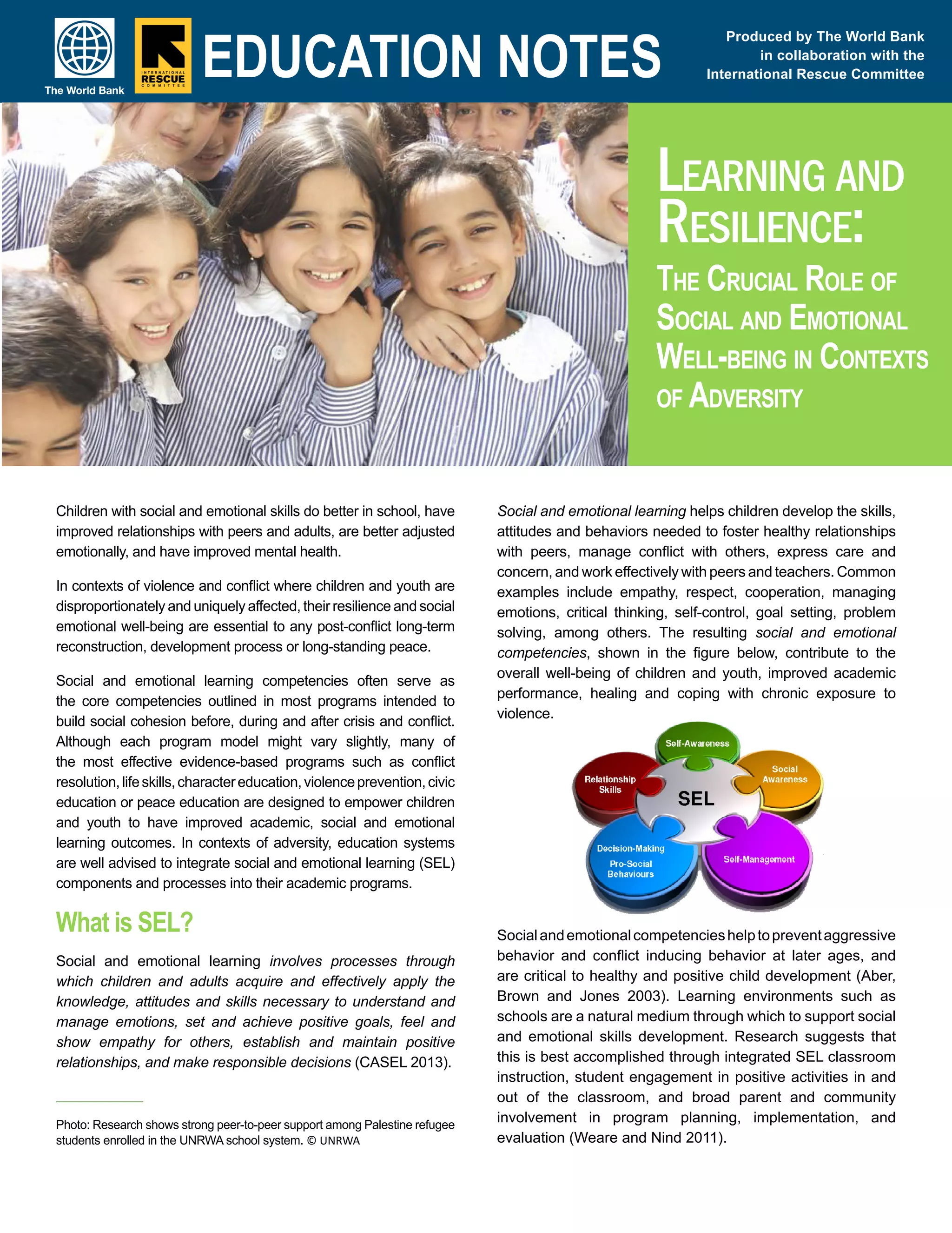 Social and emotional learning (SEL) involves developing skills like self-awareness, relationship skills, and responsible decision-making. The document discusses how SEL benefits children in several ways: it improves school performance, relationships, emotional adjustment, and mental health. SEL is especially important for children in contexts of violence or conflict, as it helps build resilience. Effective SEL programs aim to empower children and promote skills like conflict resolution. Integrating SEL into education can help children cope with adversity and prevent future conflicts. Teachers play a key role in SEL by supporting safe, caring classrooms that foster social and emotional development along with academic learning.