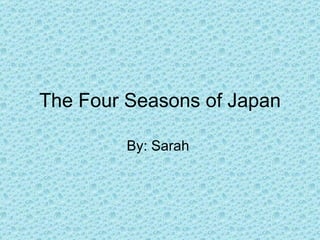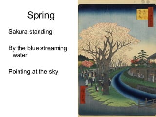 This poem describes the four seasons of Japan through haiku-style verses. Spring is represented by cherry blossoms by a stream under the sky. Summer features string lights, kimono-clad people celebrating at night. Autumn depicts red and orange leaves hanging from bare branches, bringing a peaceful feeling. Winter is represented by falling snow that makes the town cold and causes the pond to freeze.