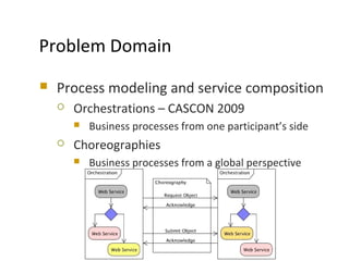 The document discusses modeling service choreographies with rule-enhanced business processes, focusing on extending the BPMN2 language to incorporate support for vocabularies and rules. It presents challenges in process modeling, such as integrating business rules and addressing redundancy, while evaluating various approaches and the implications for service interaction patterns. The authors propose a framework and tool, rbpmn, to facilitate modeling and processing of these rules in choreography, and note future work in usability and formalization.