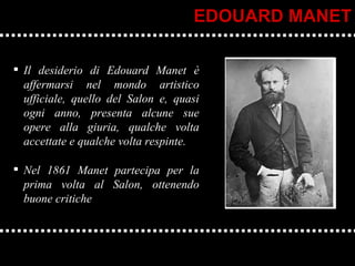 Edouard Manet, pittore francese attivo tra il 1832 e il 1883, cercò di affermarsi nel mondo artistico ufficiale, partecipando ogni anno al salon. La sua opera 'Le déjeuner sur l'herbe', esposta nel 1863, suscitò grande scandalo e lo avvicinò agli impressionisti, anche se egli stesso rifiutò di identificarsi come tale. Manet, ispirato dagli artisti alla Nouvelle Athènes e dalla sua esperienza con Claude Monet, portò a toni più luminosi nella sua pittura senza mai unirsi ufficialmente al gruppo impressionista.