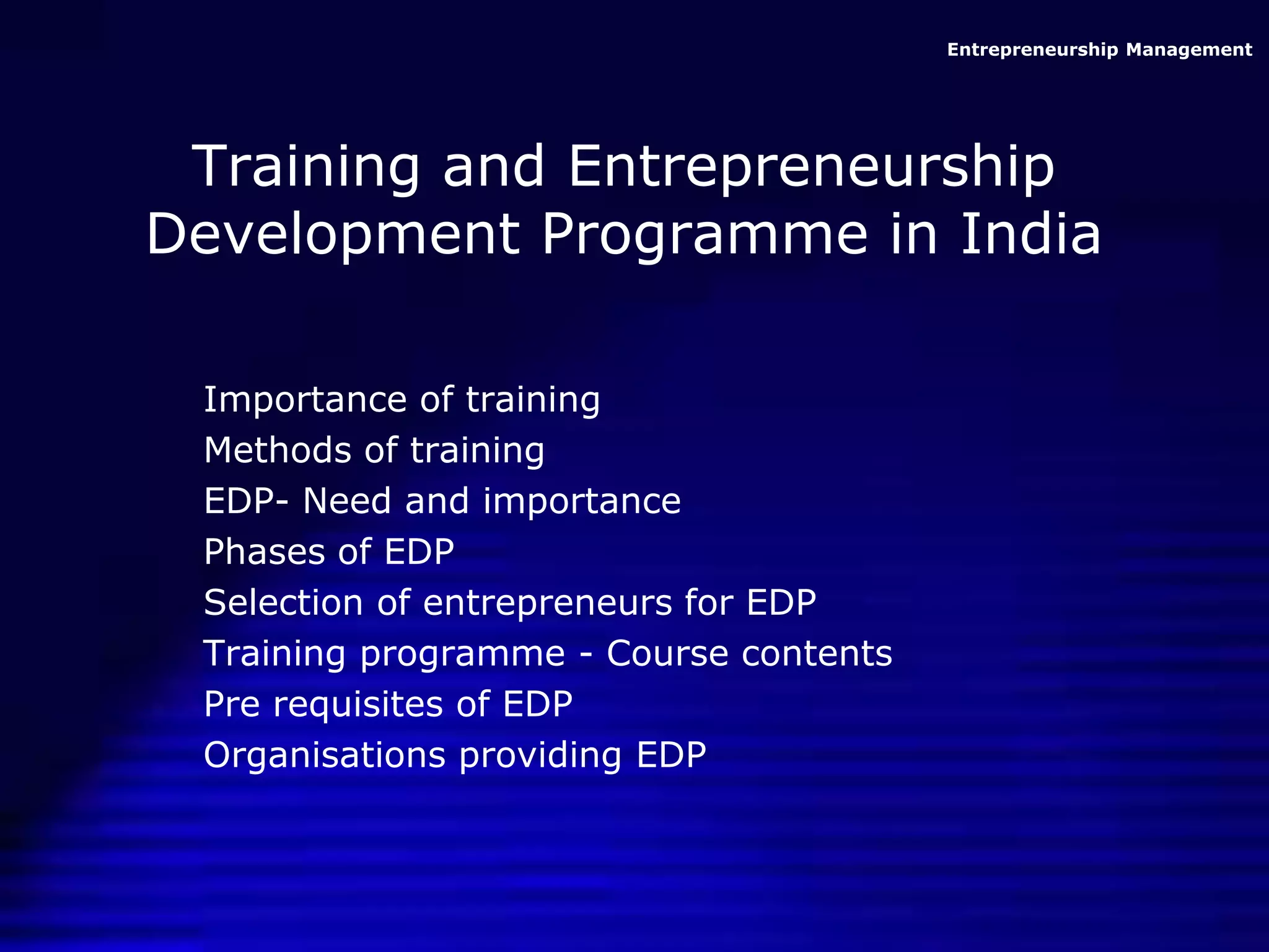 This document discusses training and entrepreneurship development programs in India. It outlines the importance of training for entrepreneurs, common training methods, and the need for and phases of entrepreneurship development programs. It also describes how entrepreneurs are selected for these programs and typical course contents. Finally, it provides details on some of the major organizations in India that provide entrepreneurship development programs, including their specific training activities.