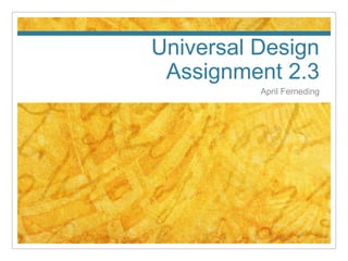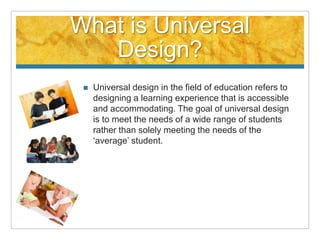 Universal design in education refers to designing accessible and accommodating learning experiences for a wide range of students rather than just average students. It involves presenting information in multiple ways using various teaching techniques and visual aids. Students should be given options to demonstrate their understanding through writing, speaking, drawing or other skills. Educators should consider engagement techniques appropriate for each lesson and the types of learners involved. The goals are to be flexible, know students' needs and strengths, and plan lessons with built-in accommodations. Universal design benefits diverse learners.