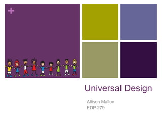 Universal Design is the process of making materials, goods, and environments usable by all people through flexible design. It has three main principles - providing multiple means of presentation, action and expression, and engagement. This allows for options in how information is perceived and understood, how people navigate and respond to their environment, and how they are motivated to engage with tasks.