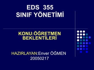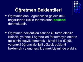 Öğretmen Beklentileri Öğretmenlerin, öğrencilerin gelecekteki başarılarına ilişkin tahminlerine beklenti denmektedir. Öğretmen beklentileri aslında iki türde olabilir. Birincisi yetenekli öğrencileri farketmeyip onların gelişimini teşvik etmemek ; ikincisi ise düşük yetenekli öğrenciyle ilgili yüksek beklenti beklemek ve onu teşvik etmek biçiminde olabilir.