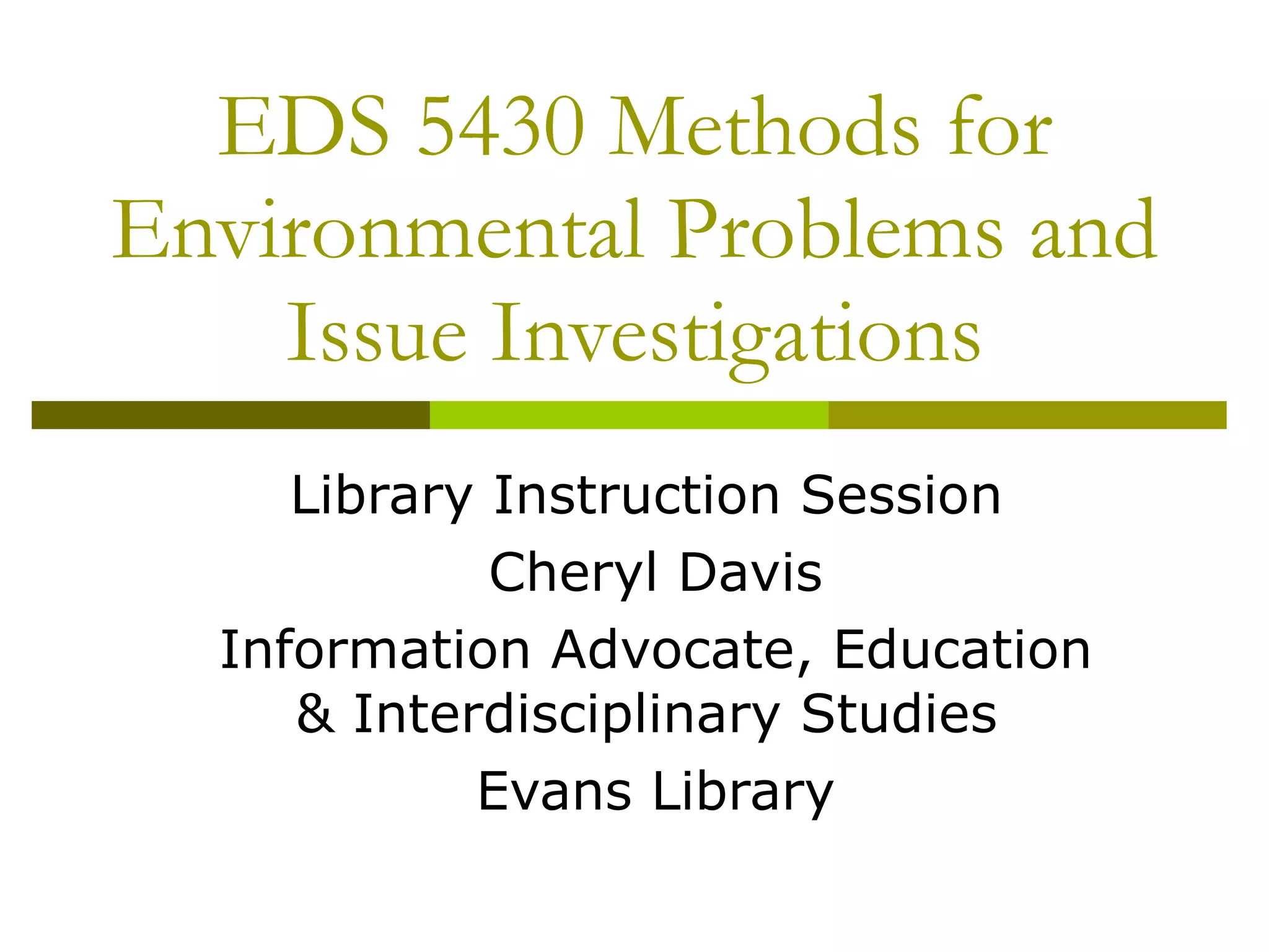 This document provides an overview of resources for research on environmental problems and issues for the course EDS 5430. It outlines journals, books, and articles that can be accessed through the library's research guide and databases. It also demonstrates how to search for materials, check availability, request items through interlibrary loan, and save references to RefWorks. Key databases and tools mentioned include the A-Z journal list, online catalog, Academic Search Complete, and RefWorks.
