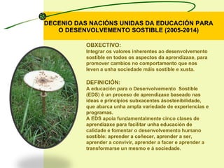 DECENIO DAS NACIÓNSUNIDAS DA EDUCACIÓN PARA O DESENVOLVEMENTO SOSTIBLE (2005-2014) OBXECTIVO: Integrar os valores inherentes ao desenvolvemento sostible en todos os aspectos da aprendizaxe, para promover cambios no comportamento que nos leven a unha sociedade máis sostible e xusta. DEFINICIÓN: A educación para o Desenvolvemento Sostible (EDS) é un proceso de aprendizaxe baseado nas ideas e principios subxacentes ásostenibilidade, que abarca unha ampla variedade de experiencias e programas. A EDS apoia fundamentalmente cinco clases de aprendizaxe para facilitar unha educación de calidade e fomentar o desenvolvemento humano sostible: aprender a coñecer, aprender a ser, aprender a convivir, aprender a facer e aprender a transformarse un mesmo e á sociedade.