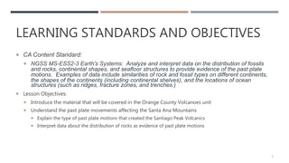 This document provides an overview of a lesson on volcanoes in Orange County, California. It explains that the Santa Ana Mountains are actually extinct volcanoes called the Santiago Peak Volcanics, which were active 5-25 million years ago. It describes how plate tectonics, specifically the convergent boundary between the Pacific and North American plates, caused magma to rise up and form these volcanoes. The document uses examples of plate boundaries, videos of active volcanoes, and a sand sample to help students understand how plate motions created the local extinct volcanoes long ago.