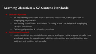 This document provides an overview of simplifying polynomials and rational expressions. It begins by stating the learning objectives and California content standards, which include applying binary operations like addition, subtraction, and multiplication to simplify polynomials and factoring polynomials to simplify rational expressions. Examples are then provided step-by-step for adding, subtracting, multiplying polynomials and factoring polynomials. An example is also worked through for simplifying a rational expression. Interactive examples are included for students to try on their own.