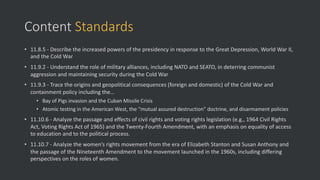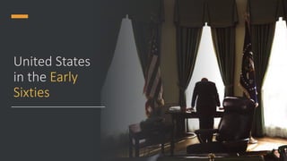 The early 1960s in the United States saw both foreign and domestic challenges. President John F. Kennedy brought optimism but faced crises like the failed Bay of Pigs invasion and the Cuban Missile Crisis that brought the world to the brink of nuclear war. At home, the Civil Rights Movement intensified as demonstrated by the March on Washington and passage of the Civil Rights Act and Voting Rights Act. Meanwhile, Betty Friedan's book The Feminine Mystique identified "the problem with no name" that many housewives felt, sparking a new wave of feminism. Kennedy's assassination cut short his "Camelot" presidency but the era saw momentous changes through confrontations with communism abroad and the fight for equality