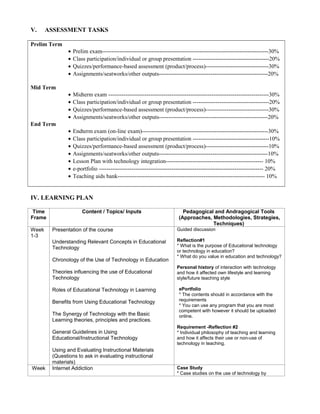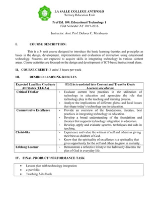 This document provides the course description, credit hours, desired learning outcomes, final products, assessment tasks, learning plan, references, and rubrics for Prof Ed. 109: Educational Technology 1 at La Salle College Antipolo. The course is a 3-unit introductory course on integrating technology in various content areas through the design and development of instructional plans. Students will be assessed through exams, presentations, quizzes, assignments, and a final lesson plan with technology integration and e-portfolio. The learning plan covers topics on educational technology theories and trends over 15 weeks using various pedagogical approaches and tools.