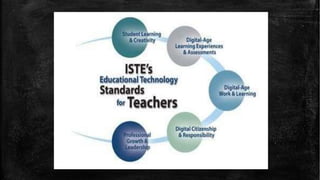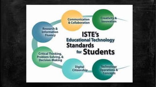 This document discusses the evolution of teachers, students, and instruction from early generations to the 21st century in light of technological advances. It notes that 21st century teachers act as channels, communicators, learners, futurists, leaders, exemplars, collaborators, and venture players. Students are now active creators of knowledge who think critically and collaborate, versus passive receivers of facts. Instruction has shifted from teacher-centered to student-centered, incorporating multimedia, collaboration, and real-world contexts. The document also outlines 21st century skills and elements that foster 21st century learning, including emphasis on core subjects, learning skills, tools, content, context, and assessments. Finally, it discusses standards for technology use in education