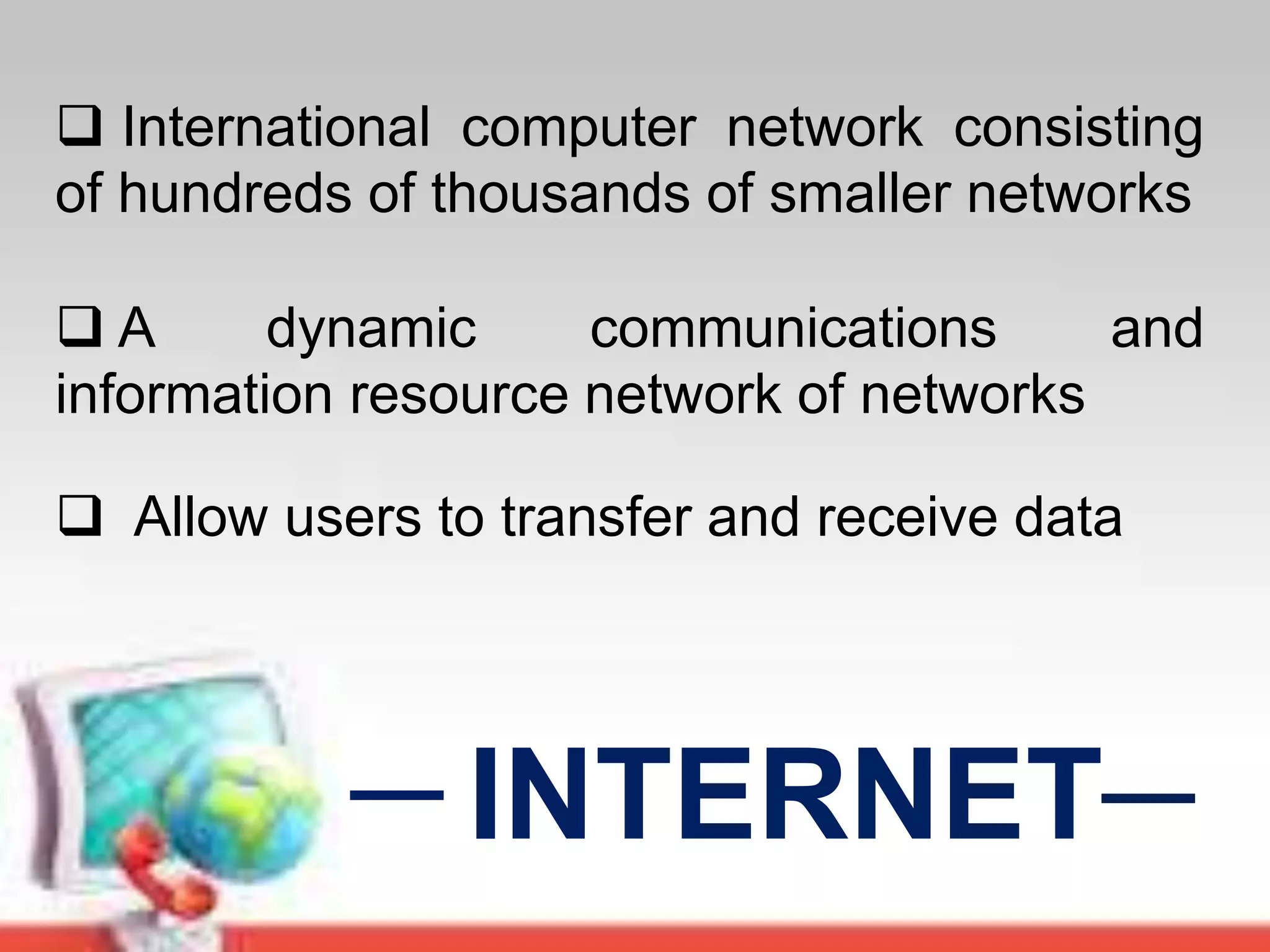 The document defines key terms related to computer networks and information technology (IT). It explains that the Internet is a global network of interconnected smaller networks that allows users to transfer and receive data. An intranet is a private, internal network within an organization that uses Internet protocols for communication. The World Wide Web is a system of Internet servers that allow for multimedia displays and online shopping. ICT refers to technological tools used for communication and managing information. Examples of ICT applications provided include using the Internet for research, PowerPoint for teaching, and interactive software for practice.