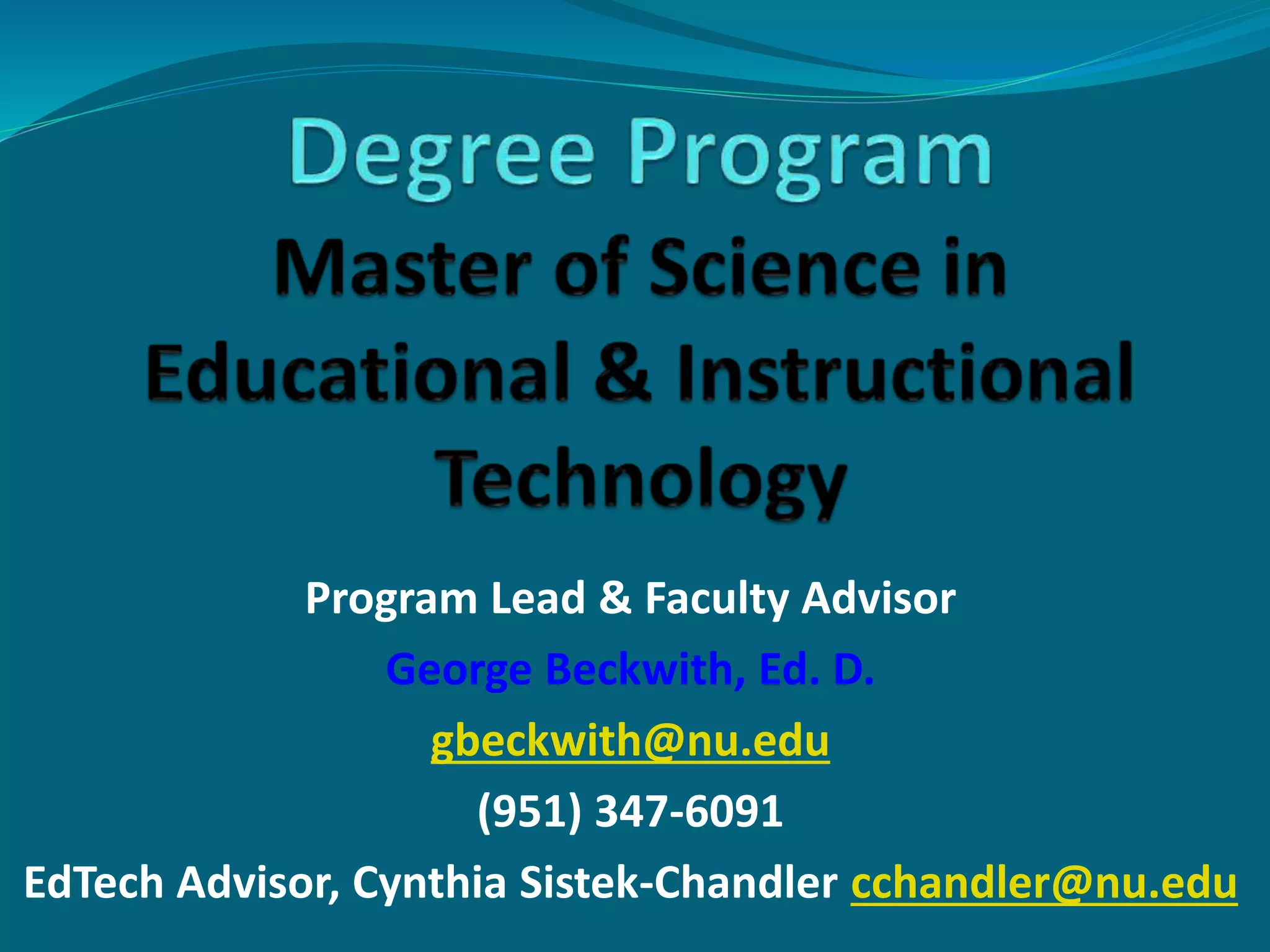 This document provides information about National University's Master of Science in Educational and Instructional Technology program. The 12-month program trains students in using technology for K-12 education, online course design, and instructional design. Key skills developed include designing engaging multimedia lessons, creating online training courses, and using software like Moodle. The degree requires 10 courses covering topics such as instructional design, educational theory, and developing online courseware. For the capstone, students build an online class demonstrating their skills. The program prepares students for careers including educational technology coordinator and online course designer.