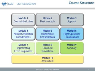 The document discusses flight operations considerations for Extended Diversion Time Operations (EDTO). It covers defining the EDTO area of operations and diversion time, EDTO flight planning, conducting EDTO flights, and conclusions. Key topics include EDTO performance data, diversion distance and speed, equal time points and time windows for EDTO alternate airports, and the effect of variables like wind and temperature on EDTO calculations. The objectives are for participants to understand flight operations requirements for EDTO operations.