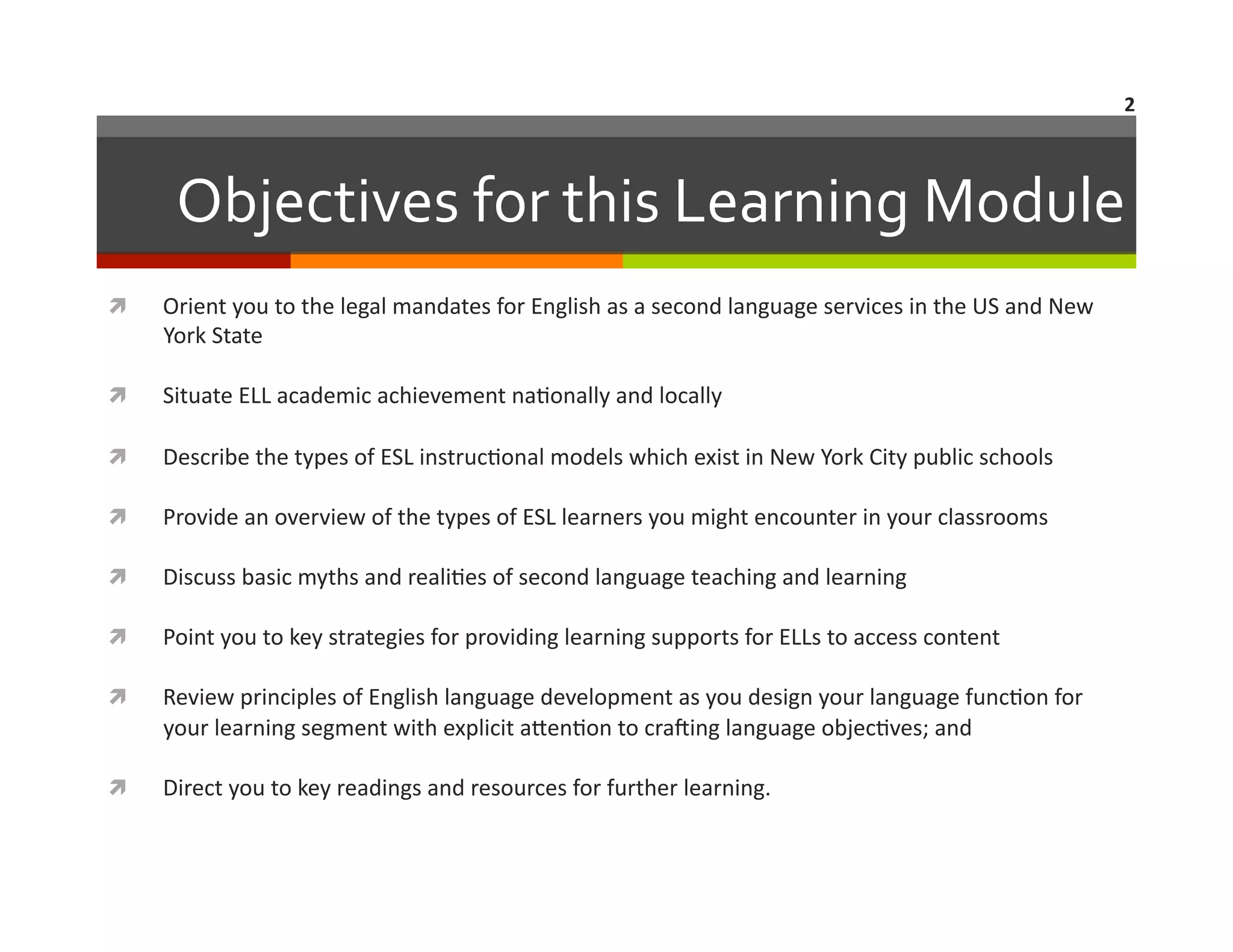 This document provides an overview of Module 6 which addresses English Language Learners (ELLs). The objectives are to orient readers to legal mandates regarding ELL services, describe ESL instructional models in NYC schools, provide an overview of types of ELLs teachers may encounter, discuss myths and realities of second language learning, and point to strategies for supporting ELLs' academic access. It summarizes key aspects of identifying and testing ELLs, the legal history around ELL rights/services, national ELL population trends including a high poverty rate, the persistent achievement gap faced by ELLs, and the need to make academic content accessible for ELLs.