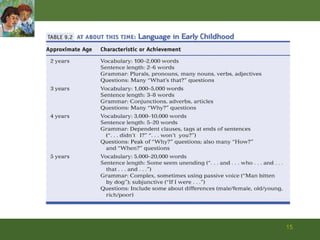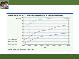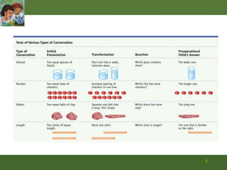 The document discusses key theories of early childhood cognitive development from Piaget and Vygotsky. Piaget focused on stages of development including preoperational thinking between ages 2-6, characterized by centration, egocentrism, focus on appearance, static reasoning, and irreversibility. Vygotsky emphasized social aspects of development including scaffolding, zone of proximal development, private speech, and social mediation. Both recognized that children actively construct theories to understand the world.