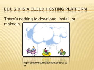 EDU 2.0 is a cloud-based e-learning platform that is free for teachers. It allows instructors to create online classes, lessons, assignments, quizzes and assessments. The platform provides analytics on student progress and supports various collaboration tools. Technical support is available through an online forum and direct assistance. The platform is designed to be easy to use on both desktop and mobile devices.