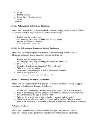 This document outlines the requirements for a comprehensive classroom technology plan assignment. It includes creating mission and vision statements, a communications plan, descriptions of how technology will be used to facilitate instruction, differentiate instruction, and support assessment. It also requires a concluding reflection on how the technology plan will increase productivity and efficiency. The assignment must be between 500-750 words for each section, cite 7-10 peer-reviewed sources, and follow GCU Style Guide formatting. It will be submitted to Turnitin through TaskStream.