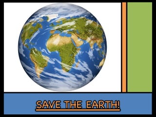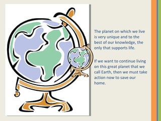 The document discusses various ways that individuals can help save the planet from environmental damage. It provides tips like reducing waste by recycling materials like paper, cans, and batteries. Other suggestions include conserving energy by turning off lights and appliances when not in use, driving less, and keeping car and home temperatures optimized for efficiency. The planet is a beautiful place that supports all life, so collective action is needed to protect it.