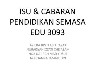 Dokumen ini membahas isu dan cabaran dalam pendidikan, termasuk gangguan emosi murid, ketidaksamaan hak pendidikan, dan kekurangan infrastruktur. Terdapat saranan untuk memperbaiki suasana pembelajaran melalui kerjasama dengan pihak yang berkaitan dan pendekatan yang sesuai. Selain itu, terdapat penekanan pada pentingnya hak pendidikan untuk semua kanak-kanak, termasuk yang hidup dalam keadaan gelandangan.