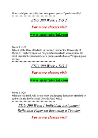 The document outlines the coursework for EDU 390, which includes various weekly assignments, discussions, and group projects related to becoming a teacher, developing teaching portfolios, and engaging with community involvement. Each week, students reflect on their teaching philosophy, create growth plans, and explore professional organizations in education. The course aims to equip future teachers with essential skills and knowledge for effective teaching and professional development.