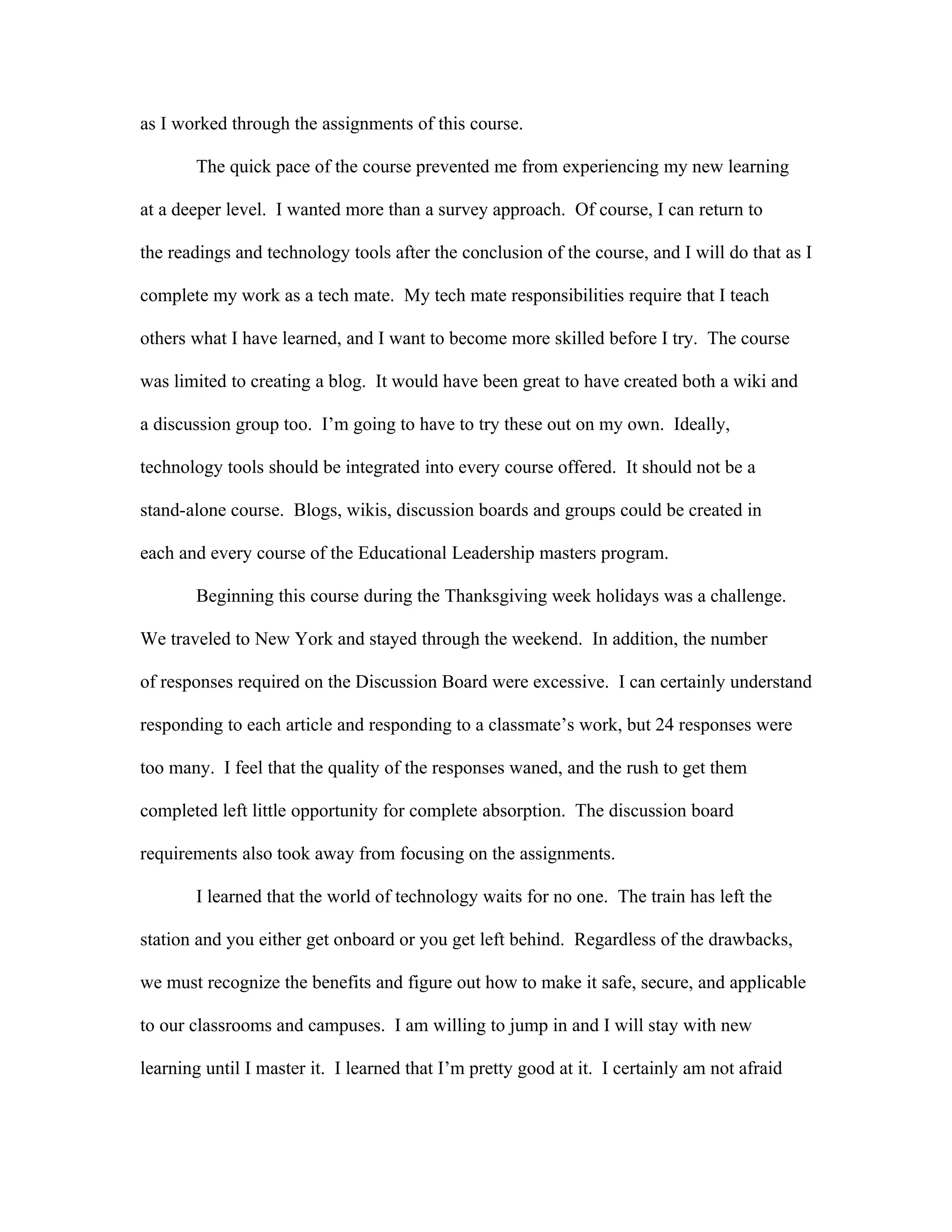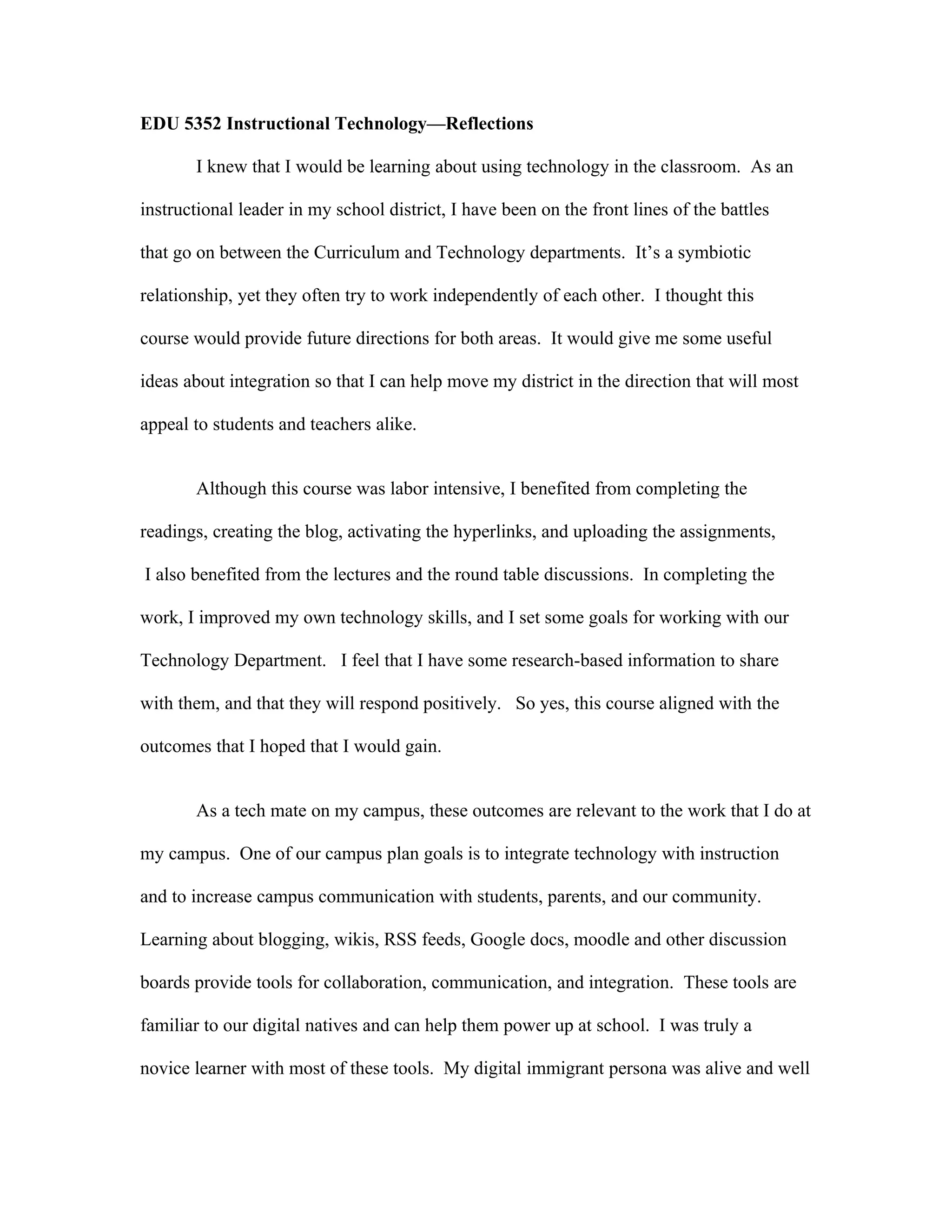 This document reflects on a course about instructional technology. The author learned about various technology tools that can be used for collaboration, communication and instructional integration, such as blogs, wikis, Google Docs and discussion boards. While the course provided useful information, the author felt it moved too quickly and did not allow deeper exploration of the tools. The author plans to continue practicing with the tools independently and apply what they learned to their role assisting with technology integration at their school.