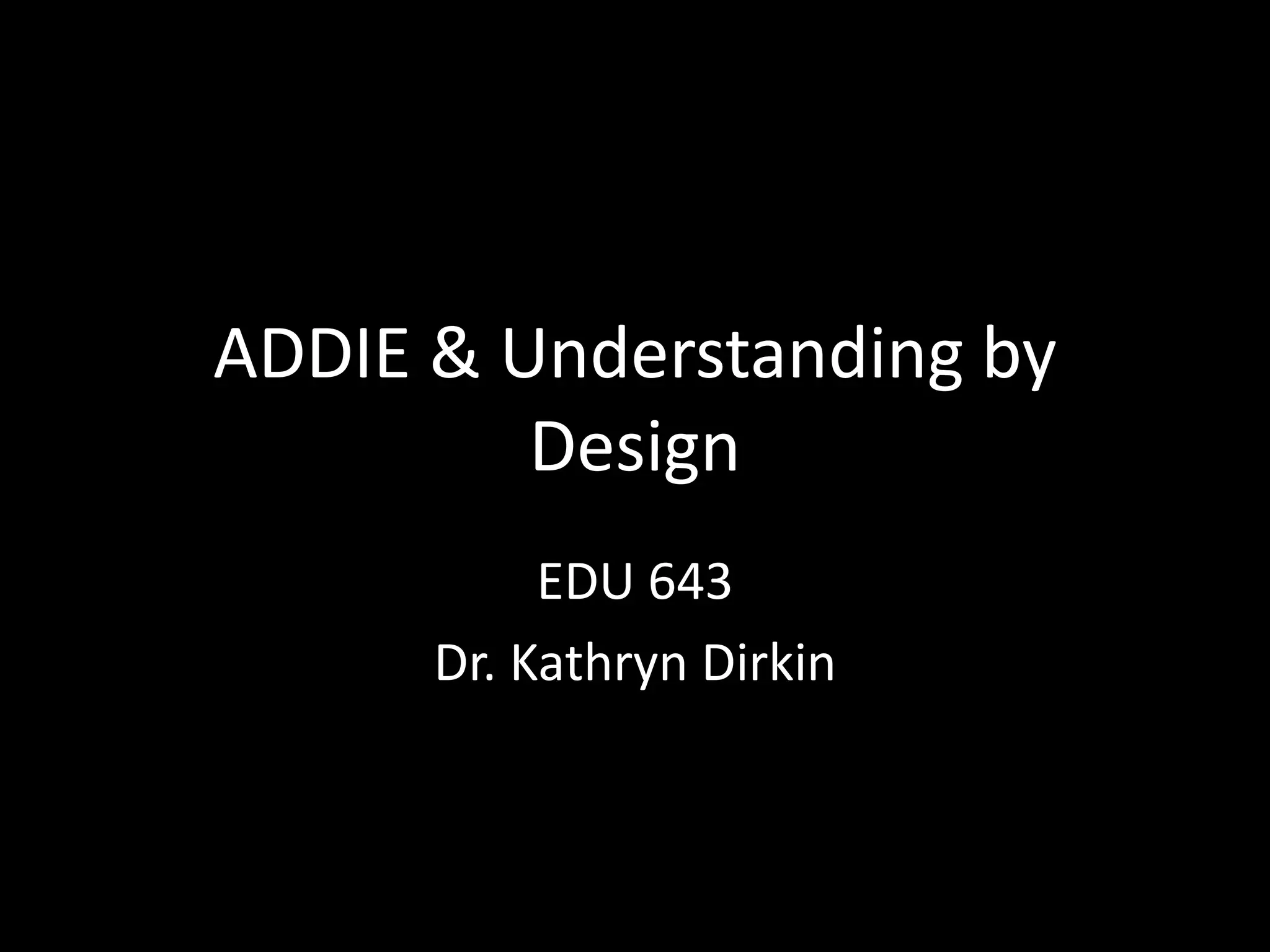 The document describes the ADDIE model of instructional design and the Understanding by Design (UBD) framework.