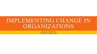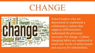 This document discusses implementing change in organizations and the challenges that come with it. It outlines the different stages of concern educators have when new practices are introduced, from initial non-use due to lack of knowledge to mastery of new strategies through reflection. It also describes five types of adopters - from innovators who try new ideas quickly to resistors who are isolated and resistant to change. The change process is not linear and will face problems that leaders must address through collaborative professional development to maintain enthusiasm and momentum for change.