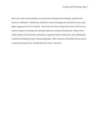 This document summarizes research on the effectiveness of using technology like interactive whiteboards in the classroom. It finds that using such technology can positively impact standardized test scores, especially when used for student-centered activities focused on visualization rather than teacher-centered presentations. The document also discusses strategies for helping at-risk students, such as providing choice, structure, customization and a blended learning approach. While technology shows promise, the strategies employed are emphasized as being more important than the technology alone.