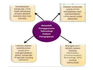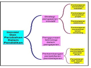 Dokumen tersebut membahasakan konsep inovasi dan perubahan dalam pendidikan, termasuk definisi inovasi, jenis-jenis inovasi dalam pendidikan, ciri-ciri guru inovatif, dan beberapa metode pembelajaran inovatif seperti pembelajaran berbasis masalah dan proyek. Dokumen tersebut juga membahas tentang peran teknologi dalam pendidikan."