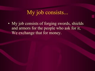 I'm a blacksmith who forges swords, shields, and armor for customers in exchange for money using tools like hammers, fire, and iron. A typical day involves waking up at 7 AM, having milk and cookies for breakfast, and working for 8 hours with my father to complete orders like 2 swords, a shield, and sometimes armor for clients like the king and knights. While tiring work, I've done it for 20 years and plan to continue for another 20 years before retiring.