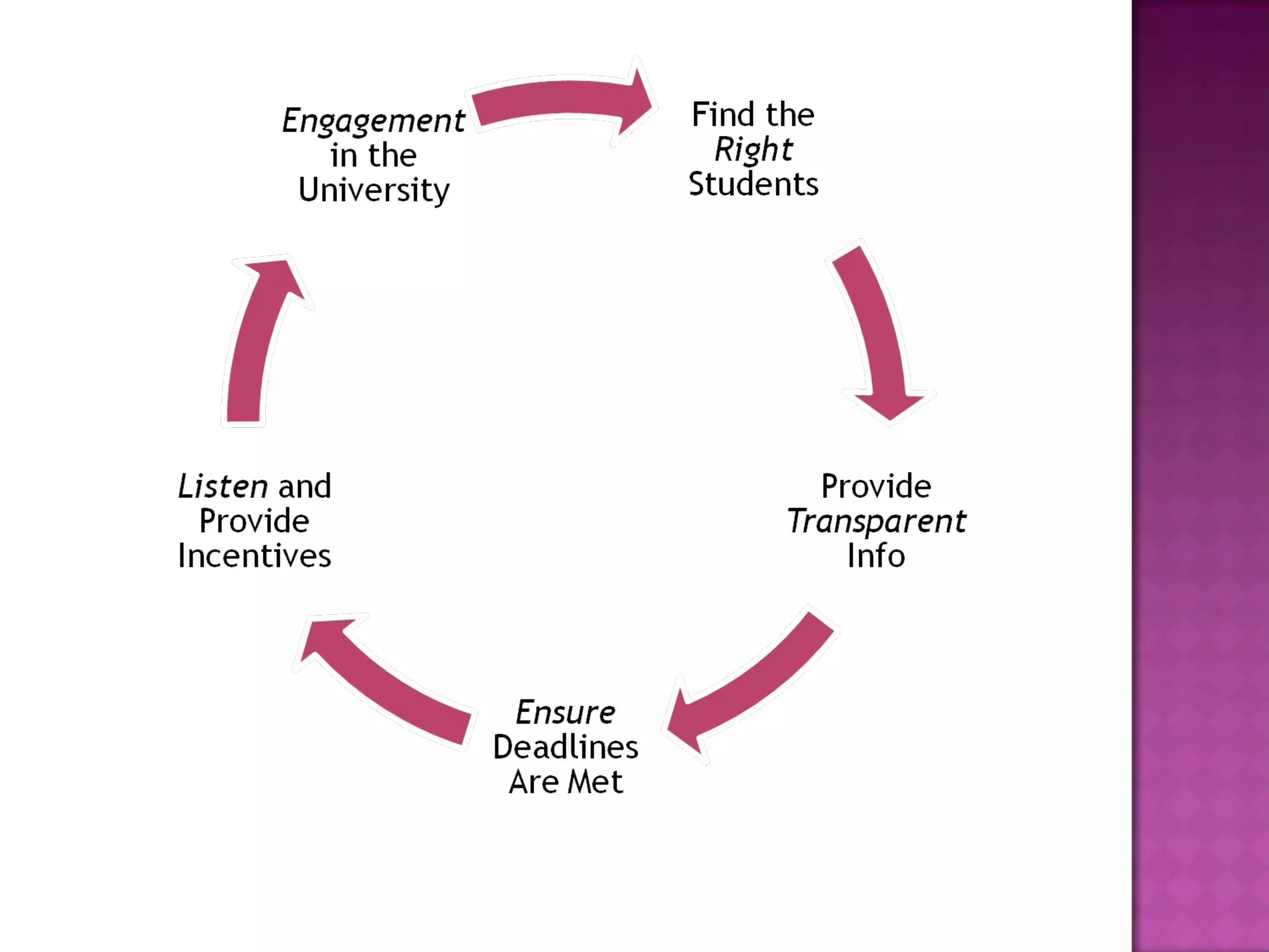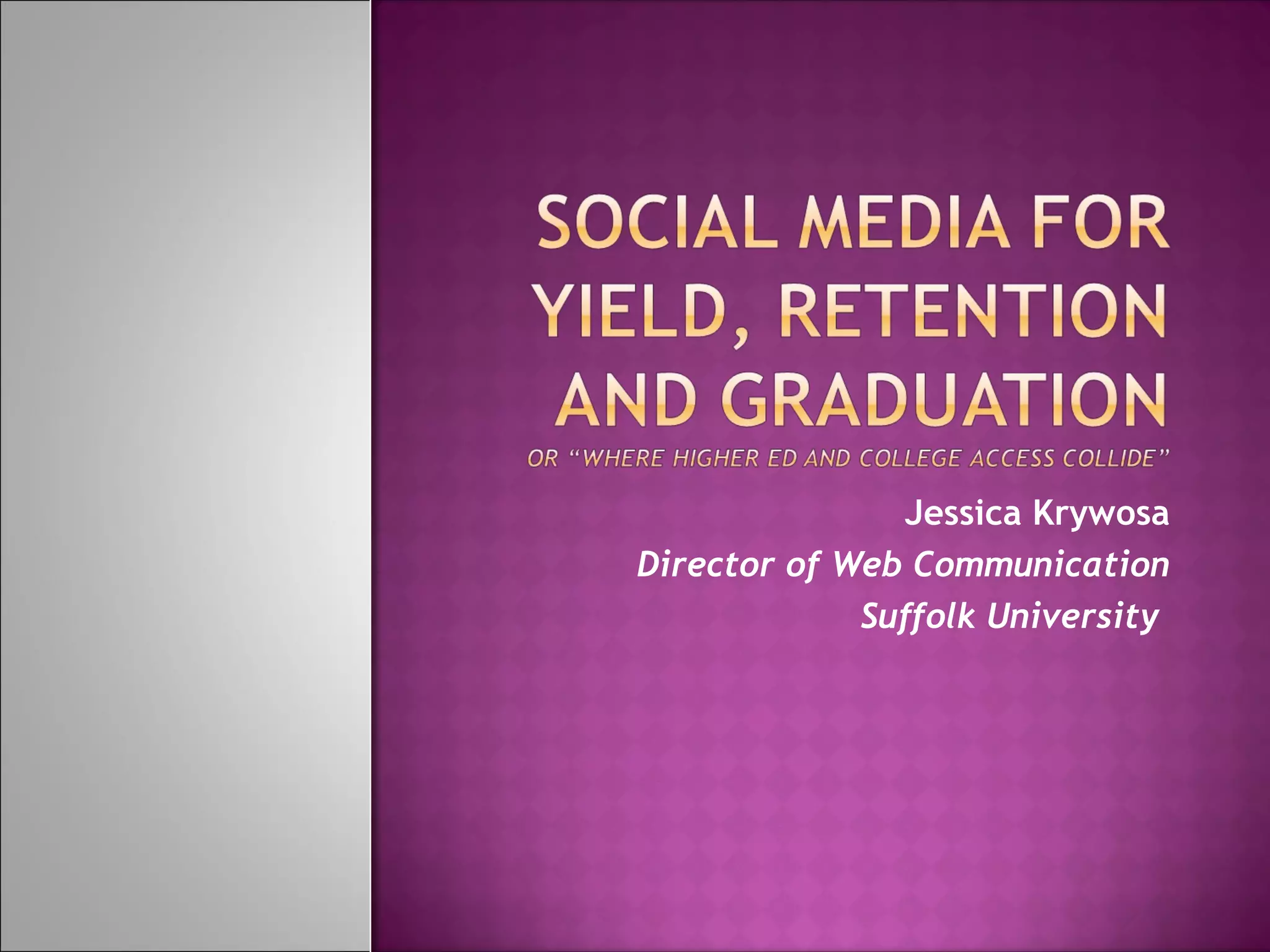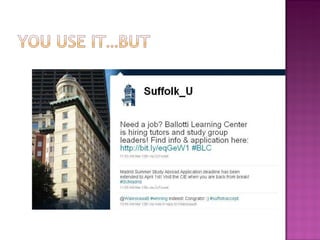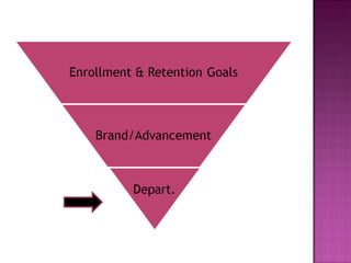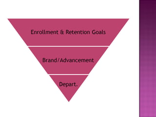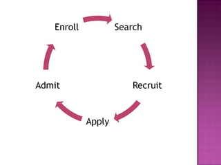 The document discusses using social media for student recruitment, engagement, and retention in higher education. It notes that the economy has influenced where students apply to college and that perceived quality, course variety, academic facilities, graduation employment rates, and graduation rates are important factors for students. It advocates using social media like Facebook, Twitter, and blogs to foster student engagement, provide timely information, and create two-way interaction. Measuring engagement and using social media for ongoing connection and marketing efforts can help with enrollment, retention, and supporting the university brand and reputation.