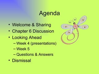 This document provides an agenda and discussion notes for an education course. It discusses creating a classroom environment where students feel free to experiment and critique each other's work. It also addresses how displaying art can influence its perception and using art to engage students' minds, bodies, and hearts. Upcoming assignments are outlined, including reaction papers and lesson presentations. The document ends with a dragonfly symbolism section and a trivia question about female dragonflies being called damselflies.