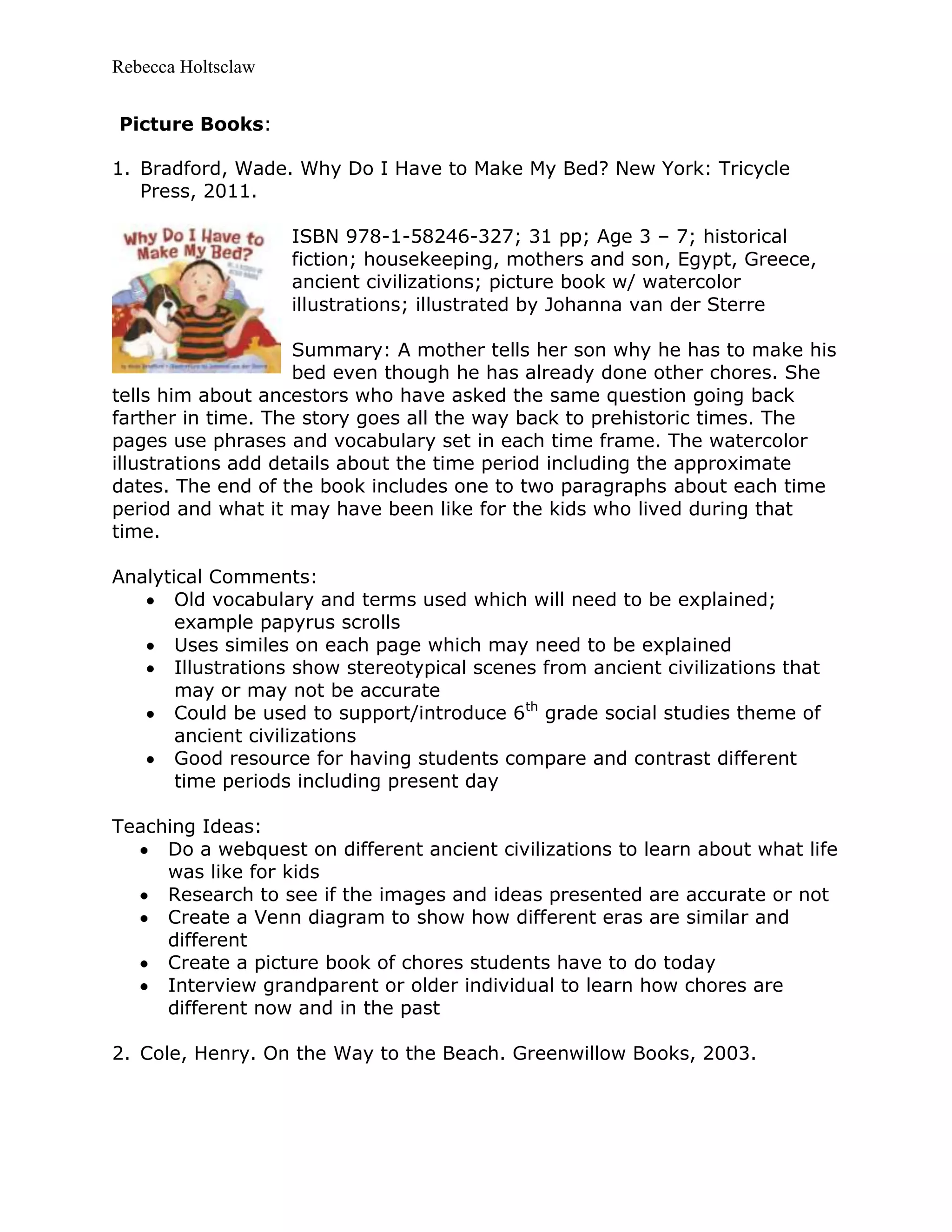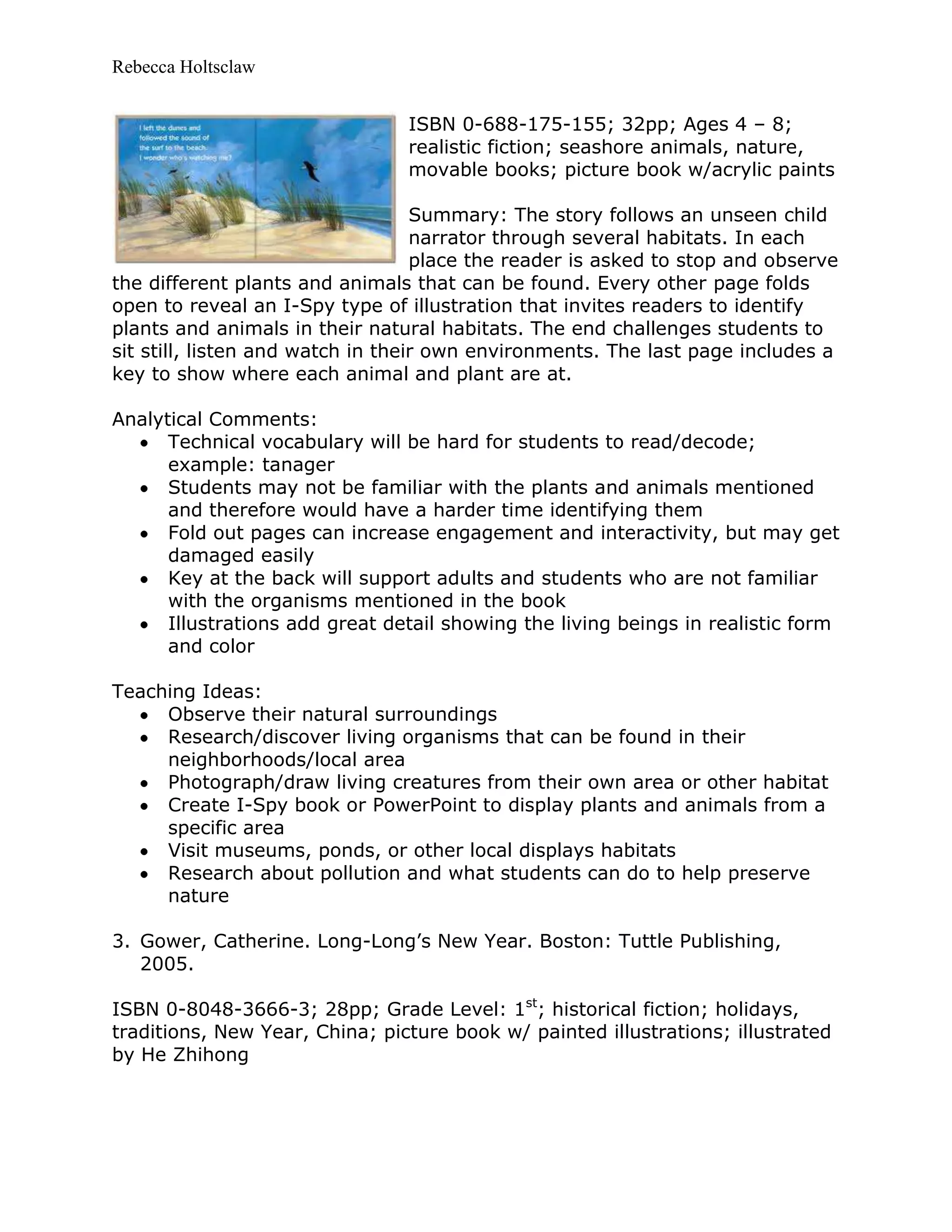 The document provides summaries and teaching ideas for 10 picture books. It describes the plot, characters, cultural references, and educational potential of each book. Some books tell folktales from places like Hawaii and China, while others teach about nature, poetry, or overcoming challenges. The books could be used to support lessons in history, social studies, writing, art, and more.