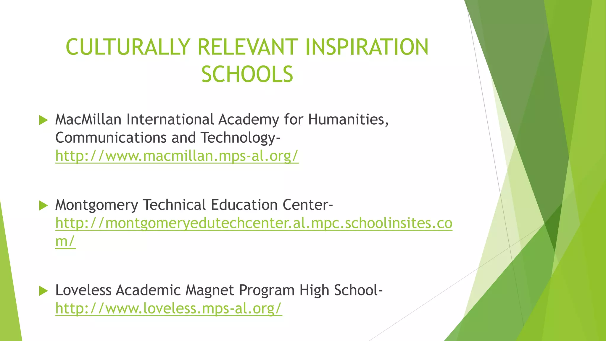This document discusses three culturally relevant schools in Montgomery, Alabama that promote diversity and inclusion. MacMillan International Academy is an IB elementary school with a diverse student body that teaches Spanish to all students and focuses on international studies. Montgomery Technical Education Center is a magnet high school with career-focused programs that uses project-based learning. Loveless Academic Magnet Program High serves intellectually talented students with an accelerated curriculum in a diverse setting. All three schools emphasize culturally relevant pedagogy, student-teacher relationships, and teaching 21st century skills to support students from all backgrounds.