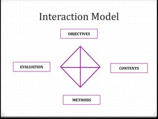 The document describes two models of curriculum development: the Interaction Model and Taba's Model. The Interaction Model is a modification of Tyler's Model that views curriculum development as a dynamic process where the four elements (objectives, content, methods, evaluation) can be addressed in any order and influence each other. Taba's Model is a grassroots approach based on Tyler's Model that emphasizes teacher input and includes seven steps: diagnosis of needs, formulation of objectives, selection of content, organization of content, selection of learning experiences, organization of learning experiences, and evaluation. The document concludes by outlining a contemporary five-step framework for curriculum development that incorporates needs analysis, objectives, content selection and organization, implementation, and evaluation