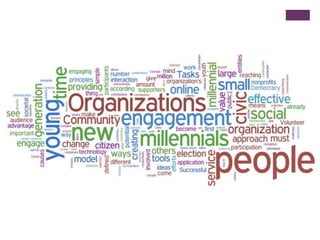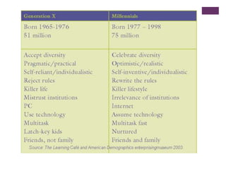 The document discusses the generational cohort known as Millennials. Millennials are born between 1980 and the early 2000s. They are very tech-savvy, comfortable multitasking and using social media. They prefer to learn collaboratively and through informal methods rather than formal instruction. At work, Millennials expect flexibility and technology use. They differ from Baby Boomers in their embrace of technology and preference for collaboration over individual work.