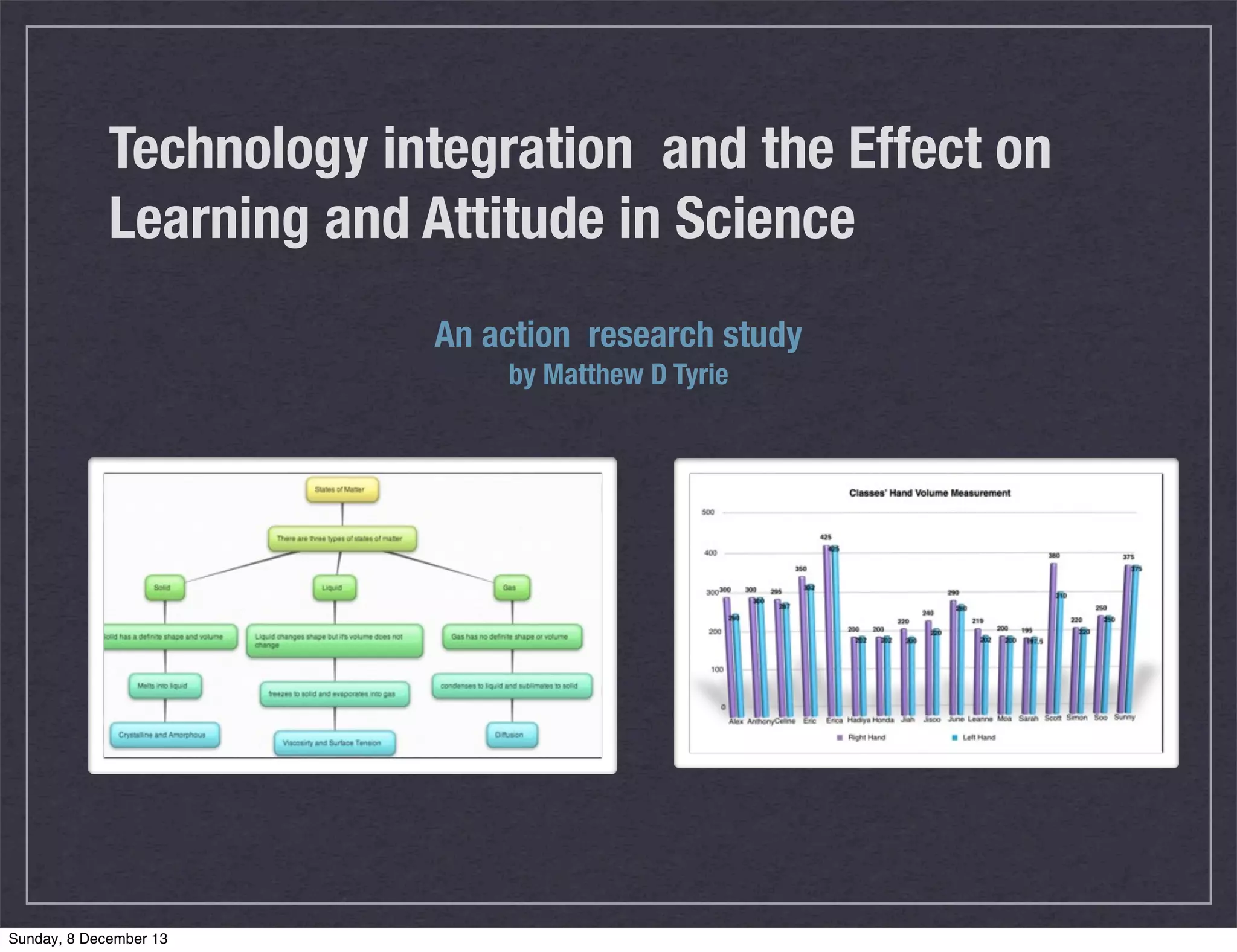 This document describes an action research study conducted by Matthew Tyrie to analyze the effect of technology integration on student performance and attitudes in science. The study involved two groups of 7th grade science students, with one group receiving traditional instruction and the other receiving instruction with additional technology-based learning tasks. Both groups were tested before and after to measure changes in performance and attitude. The results showed that the technology integration group improved more in performance but declined slightly in attitude, possibly due to some students preferring non-technology approaches. The study aims to provide insights on effective uses of technology to enhance learning.