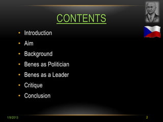 Eduard Benes was a Czech politician and statesman who was a key founder of modern Czechoslovakia. He helped lead Czechoslovakia's independence movement during World War I from exile in Paris. After independence, he served as Czechoslovakia's foreign minister from 1918 to 1935 and also had a term as prime minister. Benes twice served as president of Czechoslovakia, leading the country from 1935 to 1938 and again from 1940 until 1948, when declining health forced his resignation. He was a skilled diplomat but ultimately could not withstand pressure from Germany and the Soviet Union on Czechoslovakia's sovereignty.